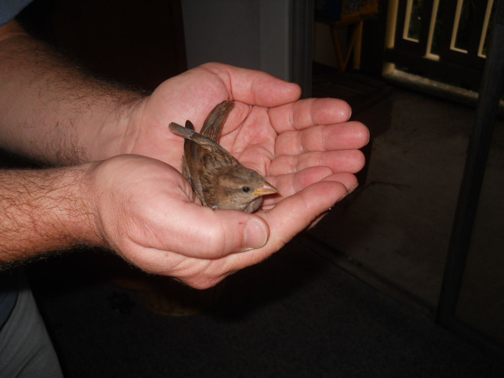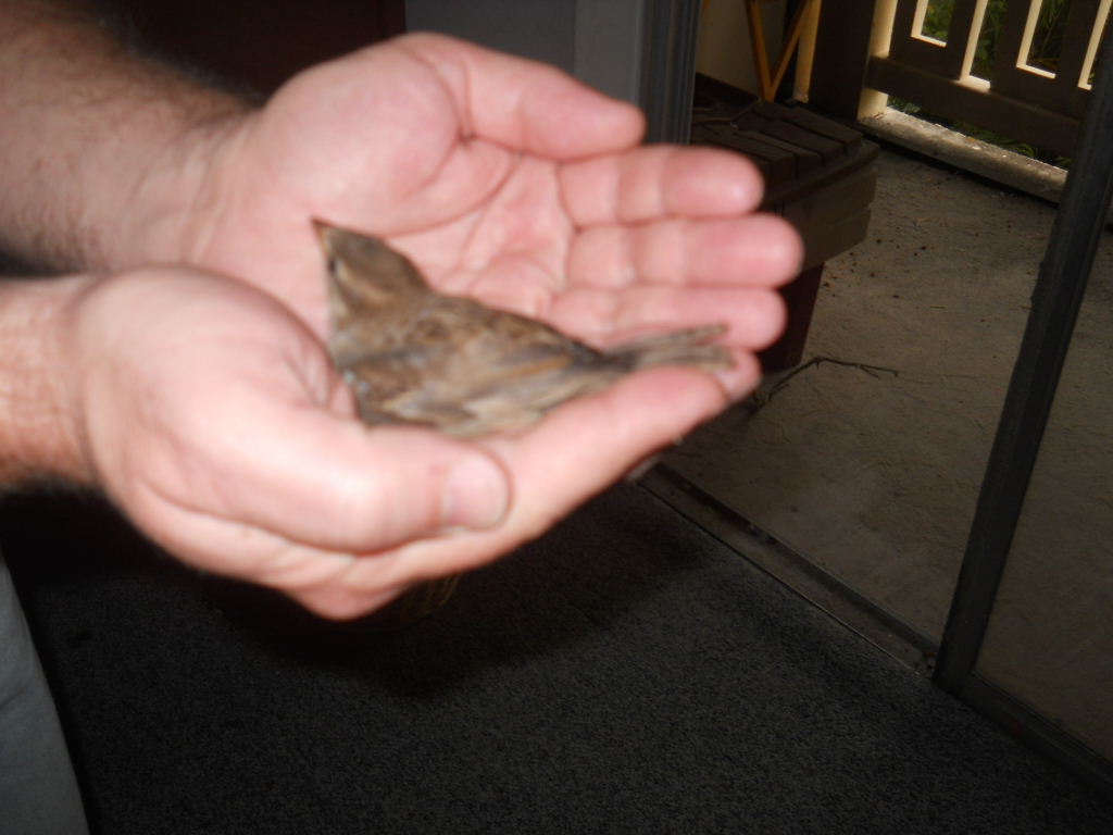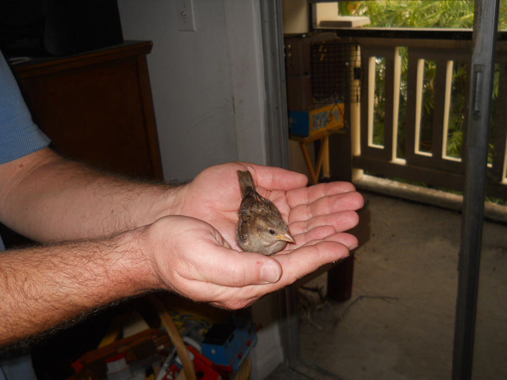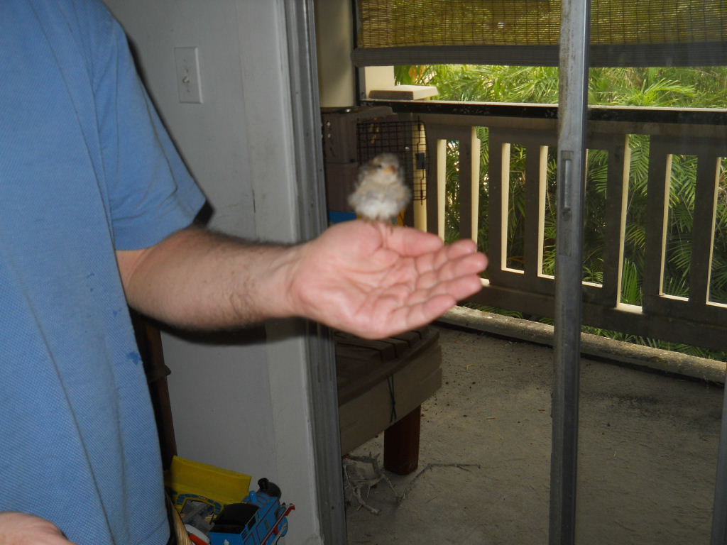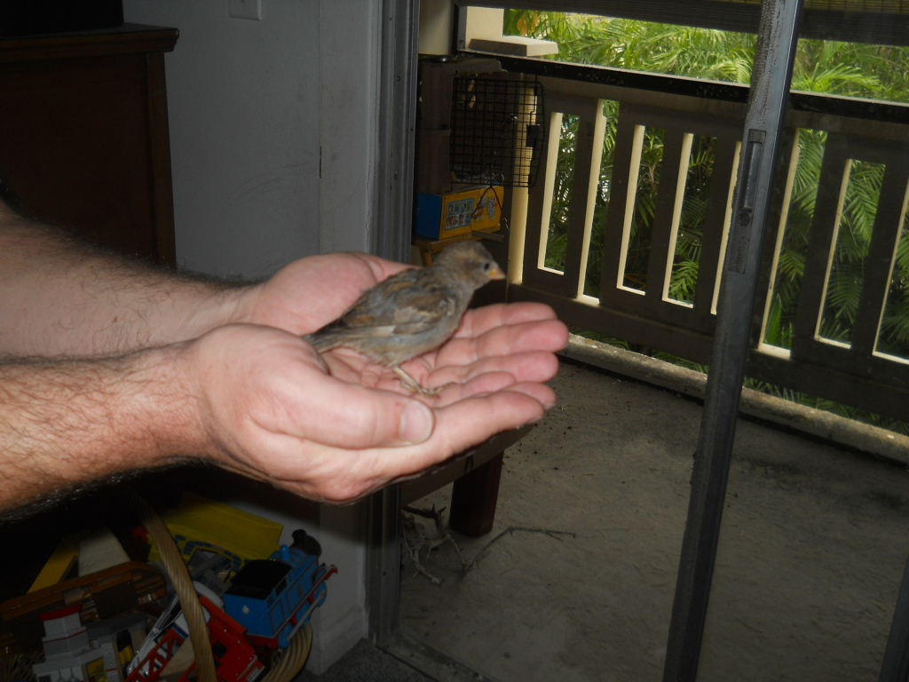 On sunday we had a thunderstom in our area. Lots of wind and rain, Jaymee's balcony got wet with the blinds flapping around messing up the tree branches my Mom collected for her to perch on. Jaymee was not happy about the wheather so she found rescue inside my parents' bedroom amongst my Mom's stack of books. My Mom secured the balcony blinds and relocated Jaymee's condo but my Mom lost sight of her and she couldn't find her. Luckily, the bird was hiding safely until my Dad came into the room. Jaymee didn't want to go back outside so my Dad had to let her perch on his shoulder and they went downstairs together until things calmed down. Below there is anothe cute video of Jaymee resting in my Dad's cupped hands. She is just too cute! Check out the video below. This file is quite large so be patient and wait for it to load up.