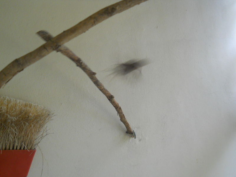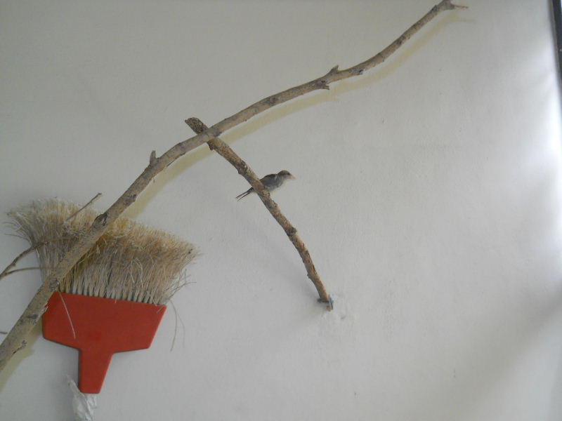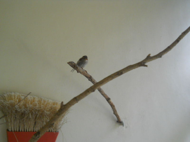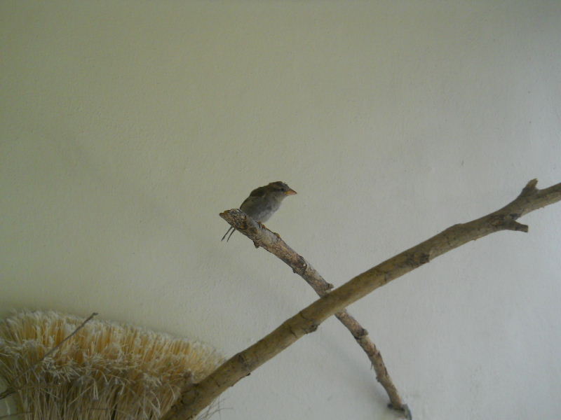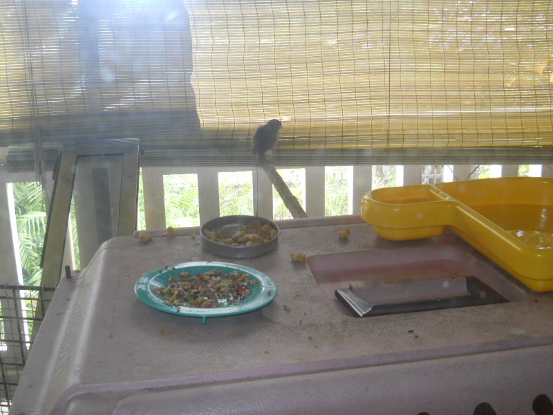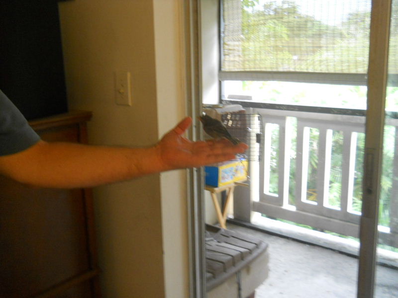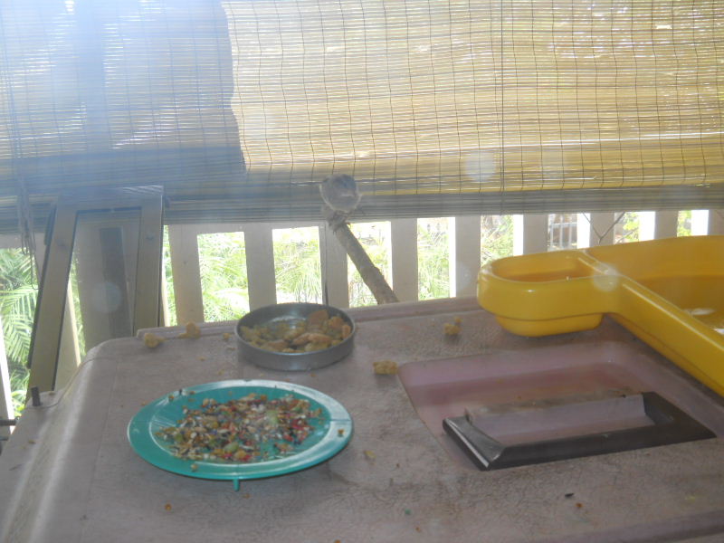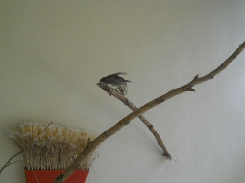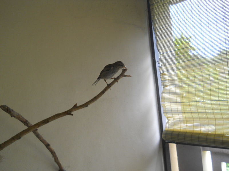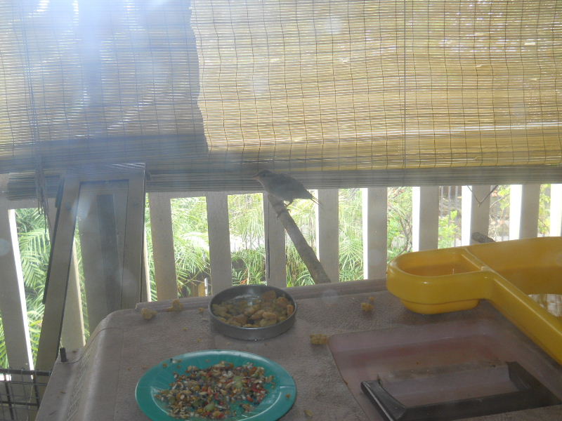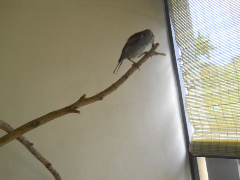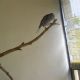 On sunday we had a thunderstom in our area. Lots of wind and rain, Jaymee's balcony got wet with the blinds flapping around messing up the tree branches I had collected for her to perch on. Jaymee was not happy about the wheather so she found rescue inside my parents' bedroom amongst my Mom's stack of books. I secured the balcony blinds and relocated Jaymee's condo but I lost sight of her and I couldn't find her. Luckily, the bird was hiding safely until Jason came into the room. Jaymee didn't want to go back outside so my Jason had to let her perch on his shoulder and Jason and the bird went downstairs together until things calmed down. Below there is the video of Jaymee after things were calm outside. Her tail is wet but because that's what she chose to do. She went feather dipping in the water left over on the balcony floor! Check out the video below. This file is quite large so be patient and wait for it to load up.