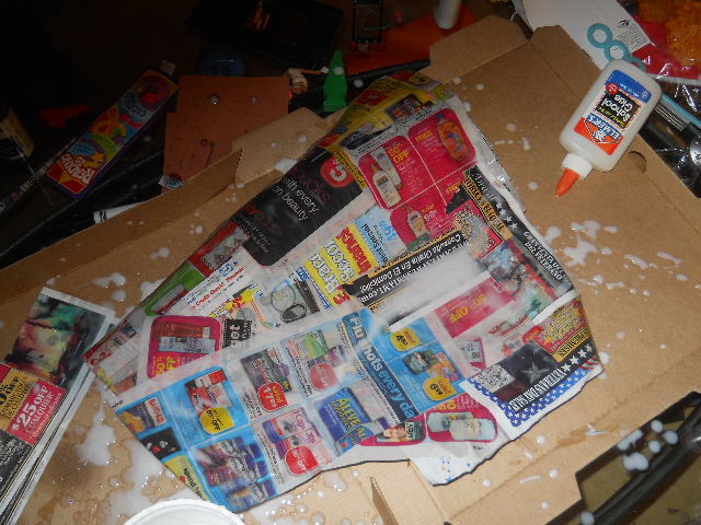 Paper mache being prepared as the foundation skin layer for the mountain, lots of glue and newspaper scraps