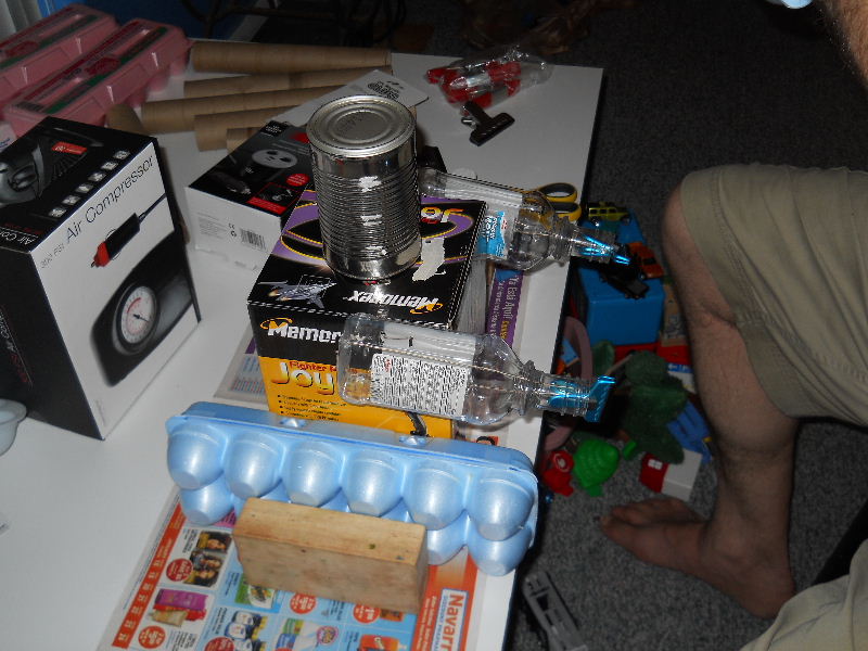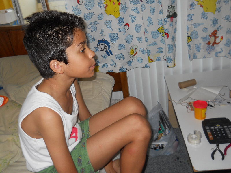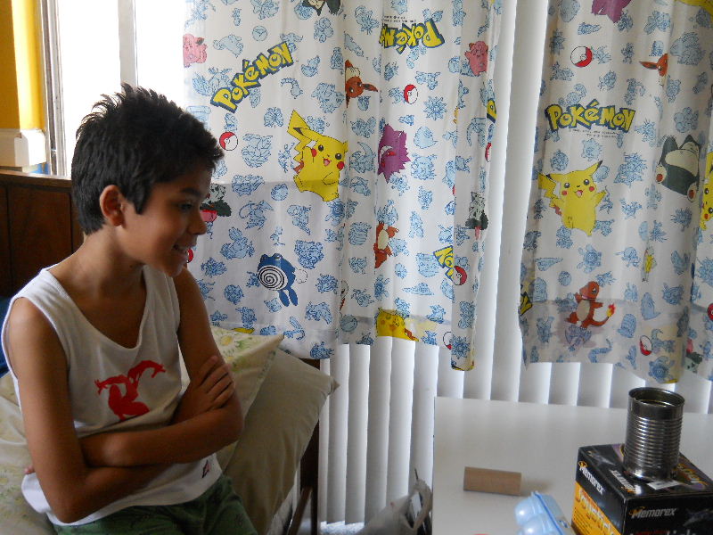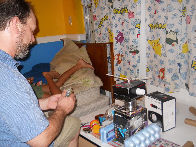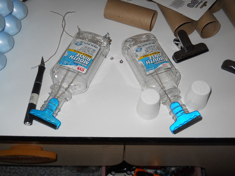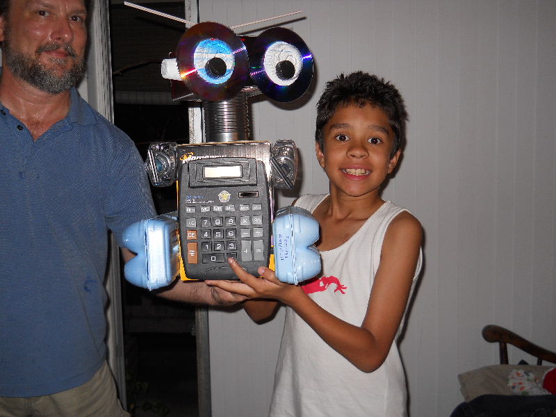 It was a fun project and we had to buy nothing to complete it, not even glue or tape. The wires inside the empty bottles of listerine that made the arms were made out of twist ties from toy boxes. Have fun and be inspired to create your own recycled robot with your little ones!