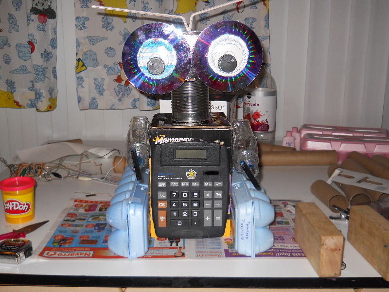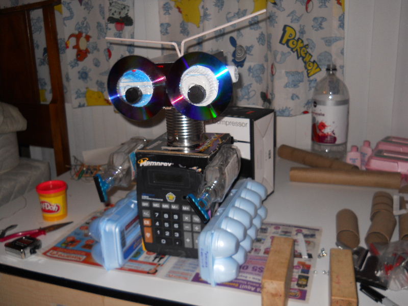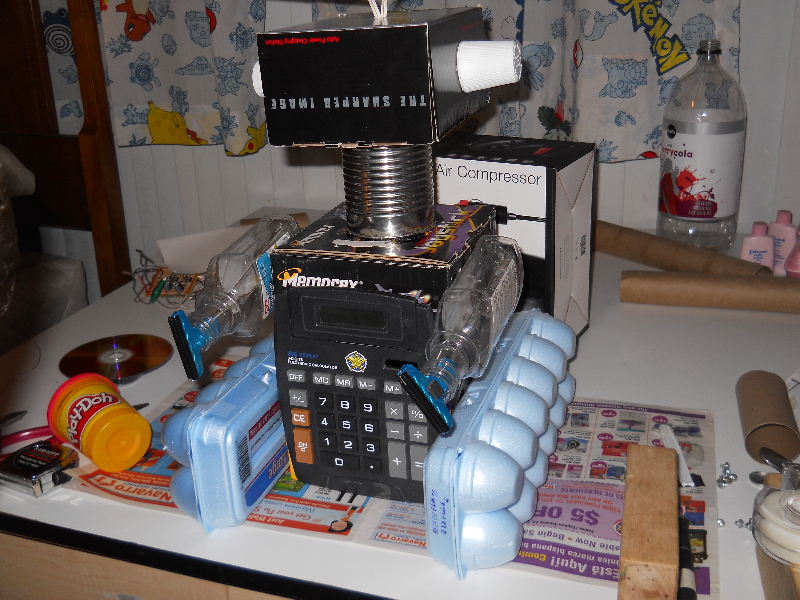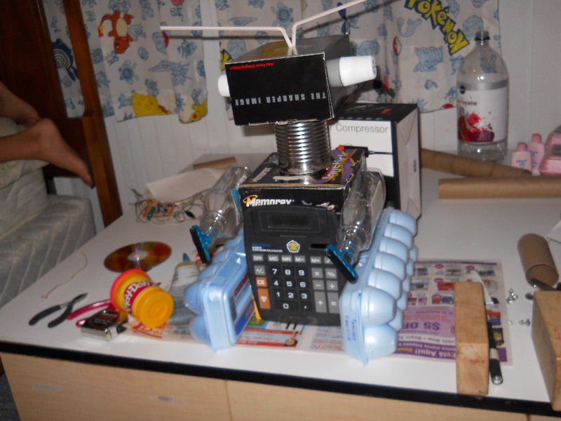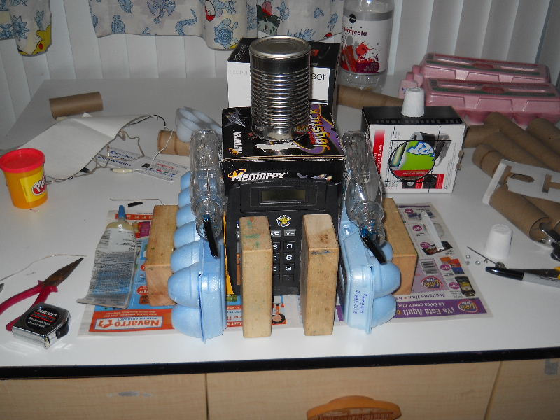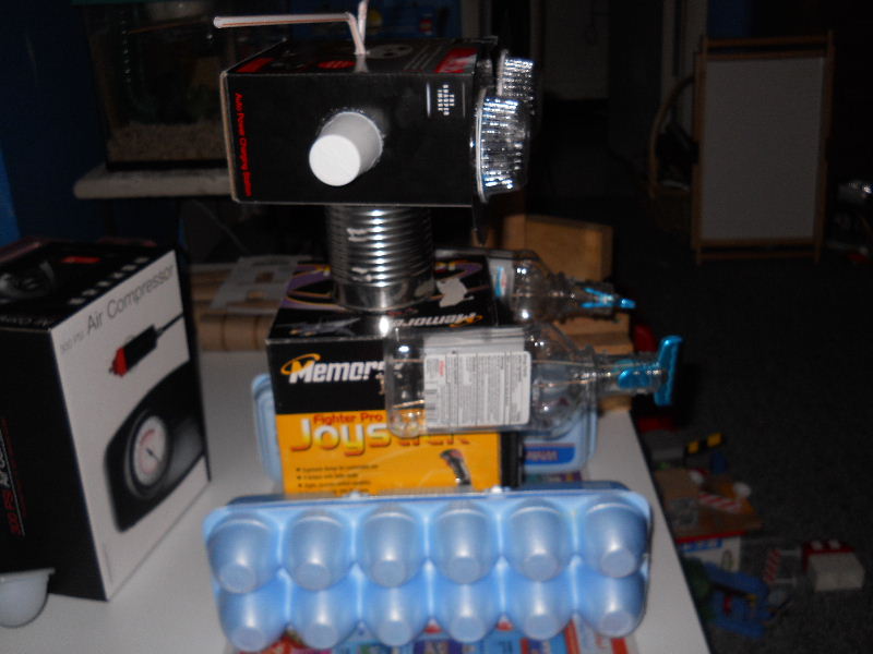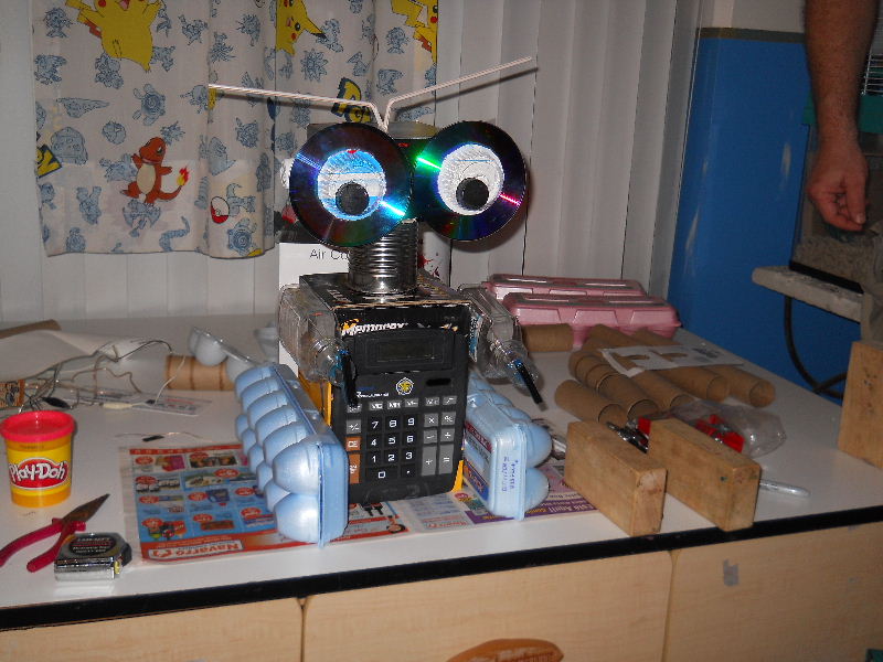 The rules read that the robot not be more than 15inches tall, the components have to be those from household items one would toss in the trash. Allowed new components were glue, packing tape, staples, wires and nothing else needed to be purchased. We followed the instructions and below are the images of the final product.