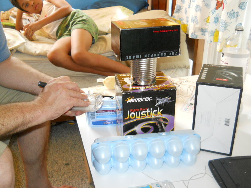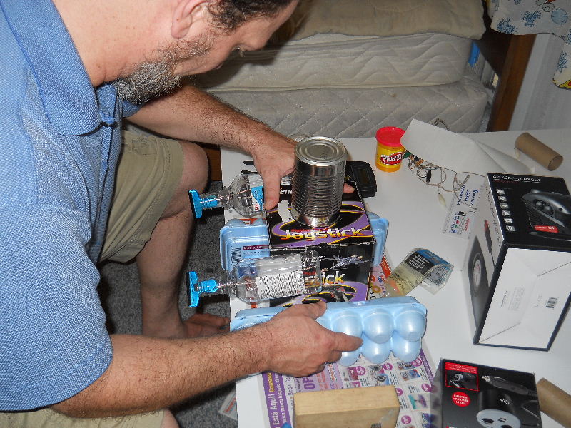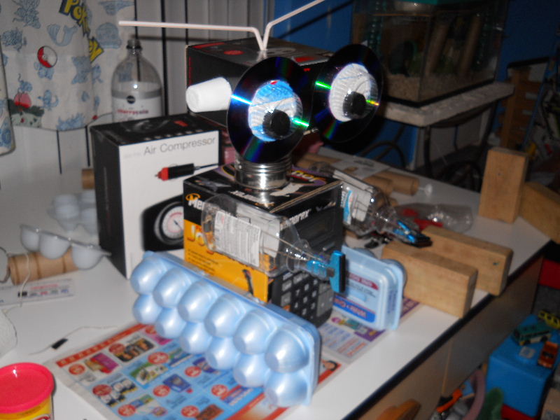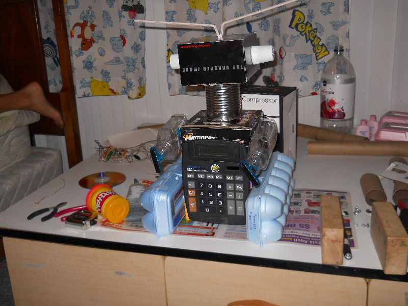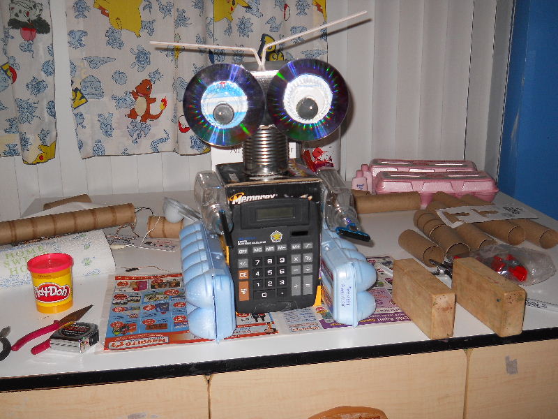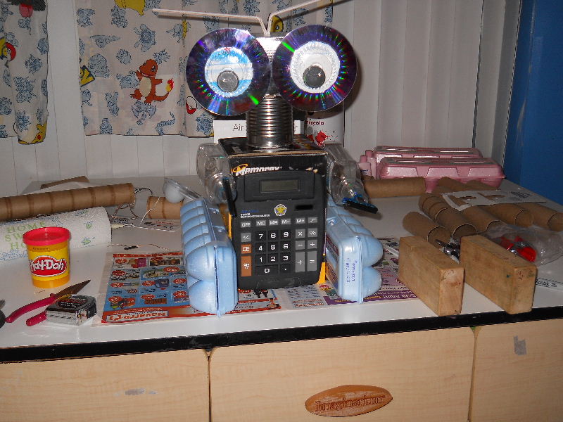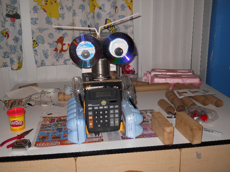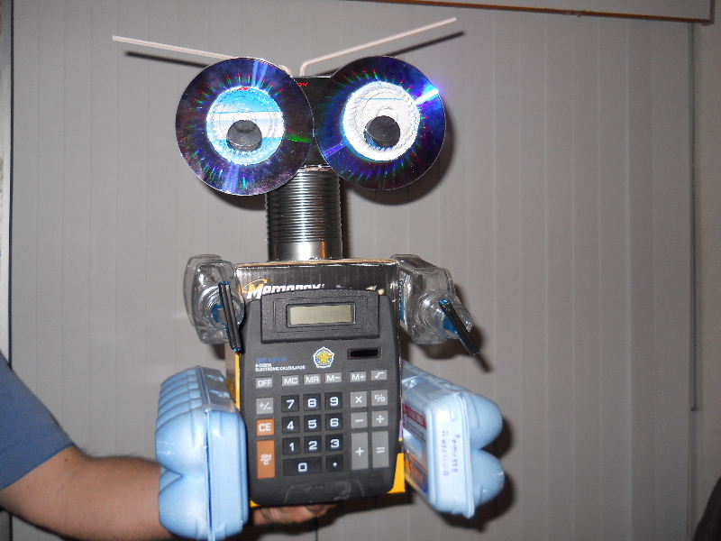 The rules read that the robot not be more than 15inches tall, the components have to be those from household items one would toss in the trash. Allowed new components were glue, packing tape, staples, wires and nothing else needed to be purchased. We followed the instructions and below are the images of the final product.