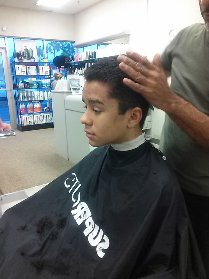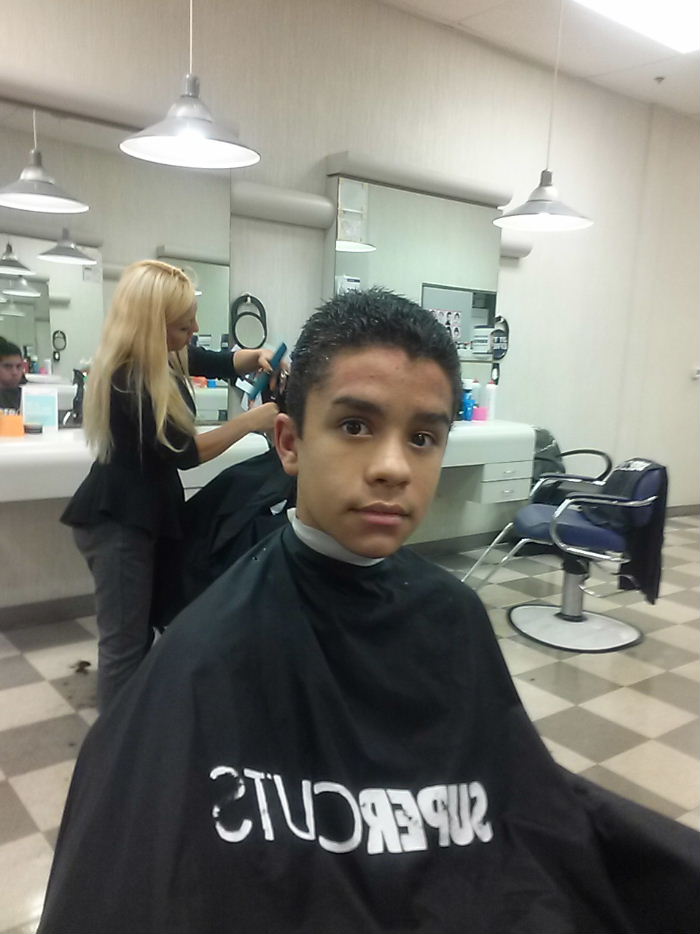 Nicolas got a haircut this evening in time for the school picture -Cortada de cabello de Nicolas esta noche para las fotos de la escuela- En la segunda, el no queria posar. The second pic he was not willing to pose so he looks "unwilling"!